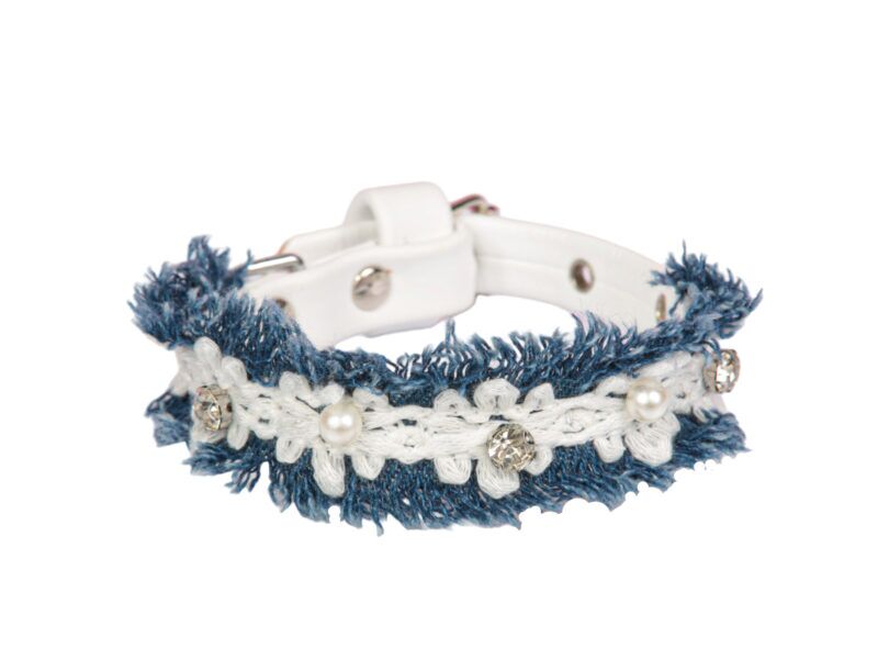 Romantic collar in faux leather, embellished with trimmings in jeans, flowers and pearls. Color: white. Finishing: silver. The small metal parts are nickel free. Collar height: 1.2 cm.re nickel free. Collar height: 1,5 cm.
