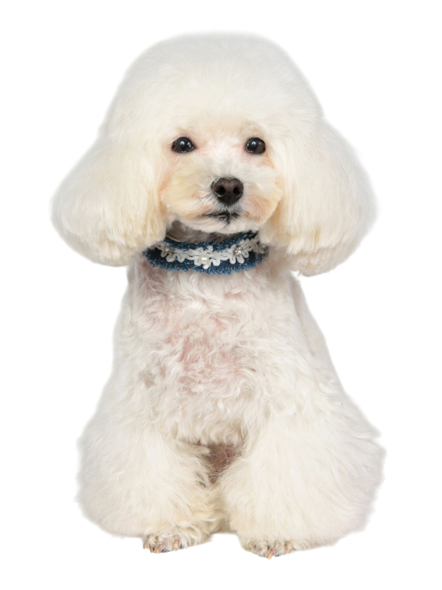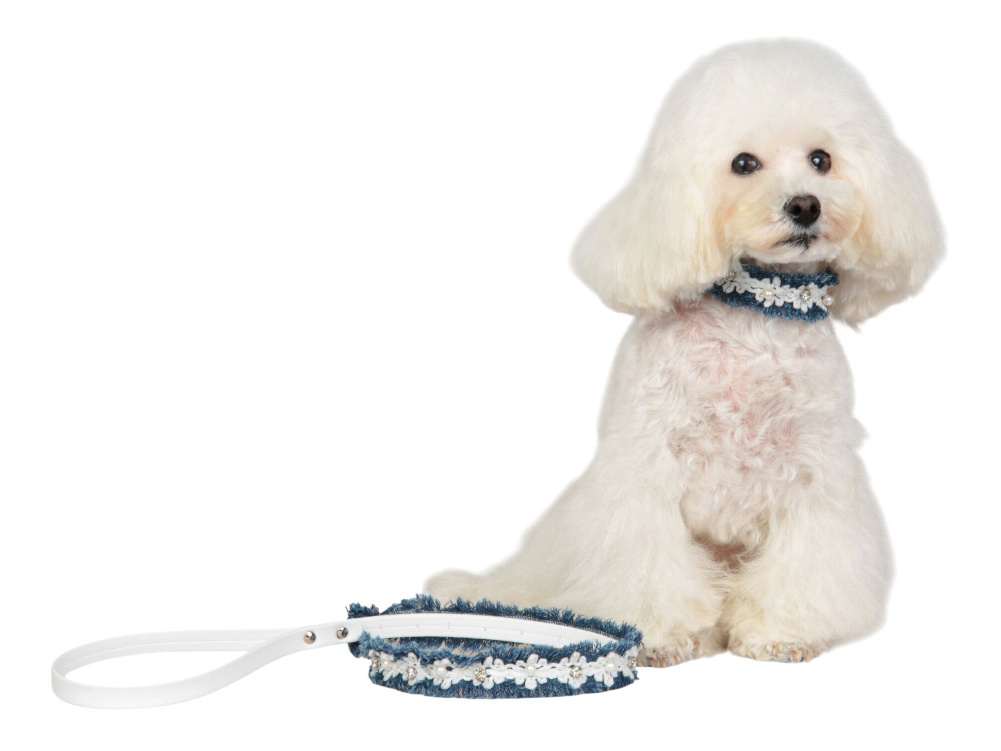Romantic collar in faux leather, embellished with trimmings in jeans, flowers and pearls. Color: white. Finishing: silver. Collar height: 1.2 cm.