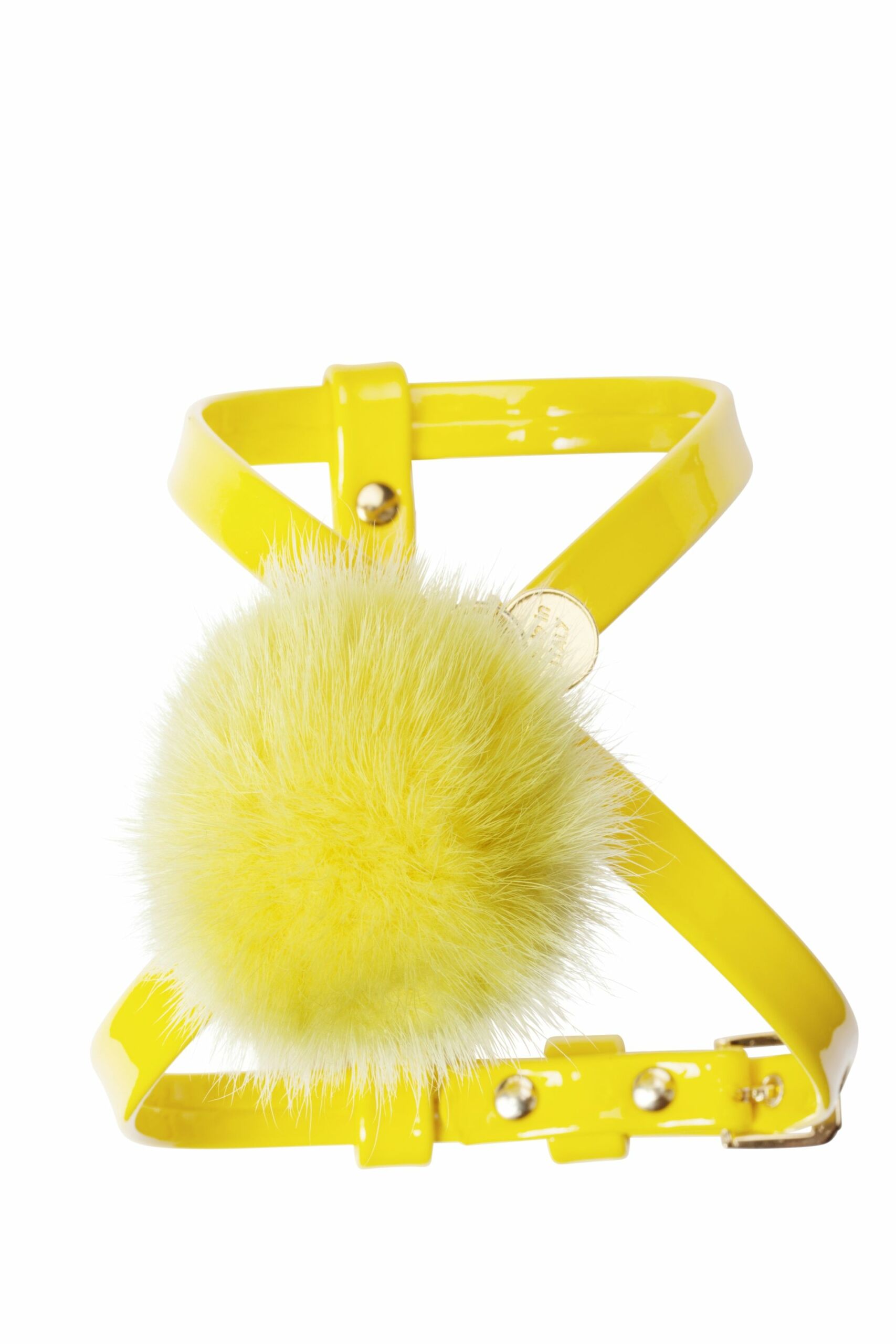 Delightful harness, embellished with a soft pom pom. All strictly hand-sewn. Color: cobalt blue, fuchsia nappa, red lack. Finishing: gold.
