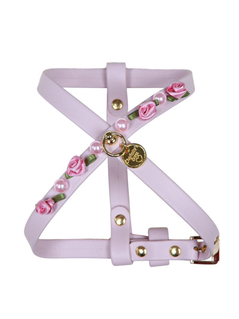 Romantic faux leather harness, embellished with pearls and small hand-sewn satin roses. Finishing: gold. Collar height: 1.2cm.