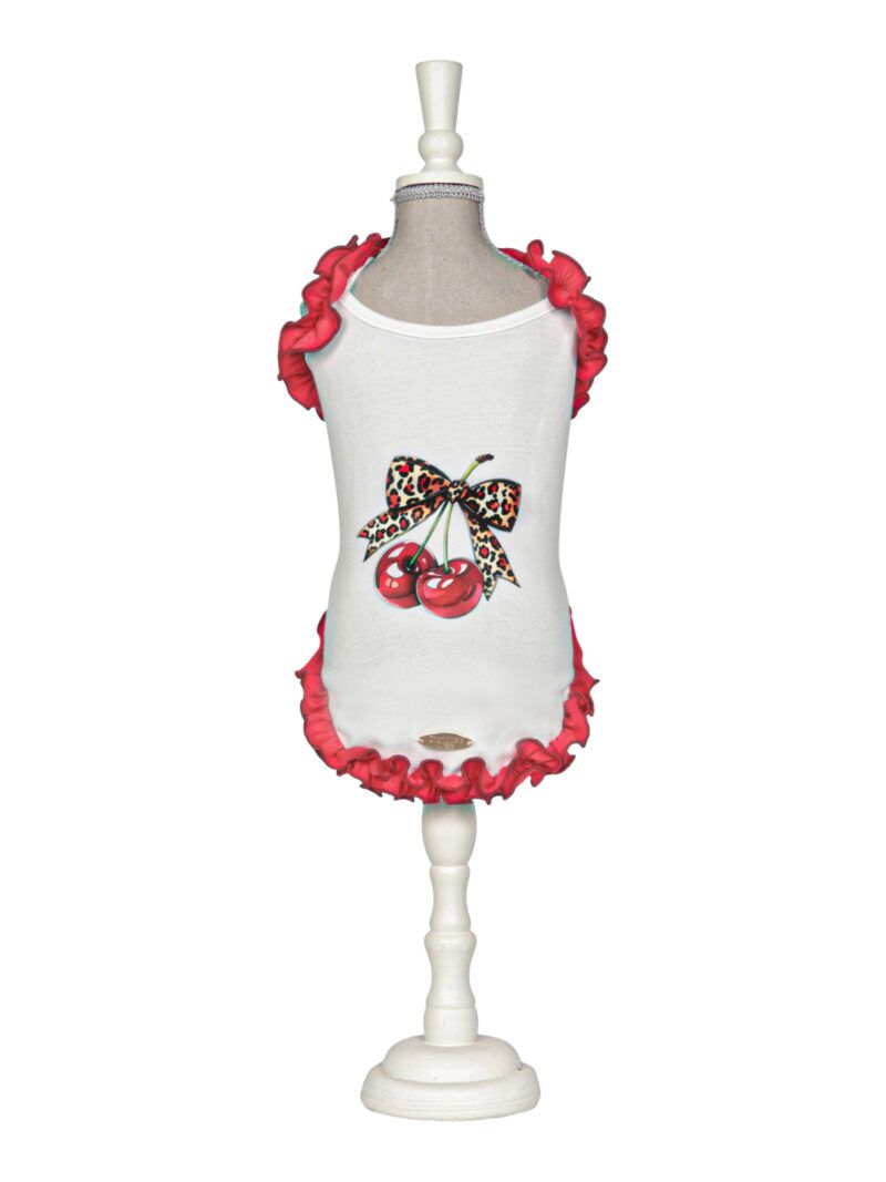 Lively organic cotton jersey tank top decorated with a stylish cherry on the back and edged with contrasting red rouche. Colour: white.