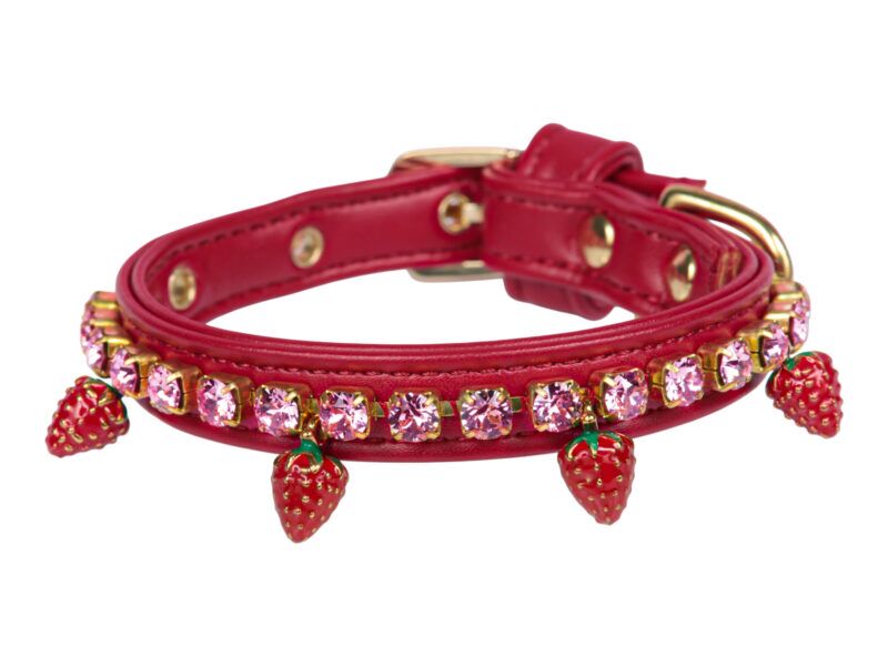 Delightful collar, in soft faux leather, decorated with rhinestone chain and strawberry shaped enamel charms. The item is completely hand-sewn. Finishing: gold. Collar height: 1,2 cm.